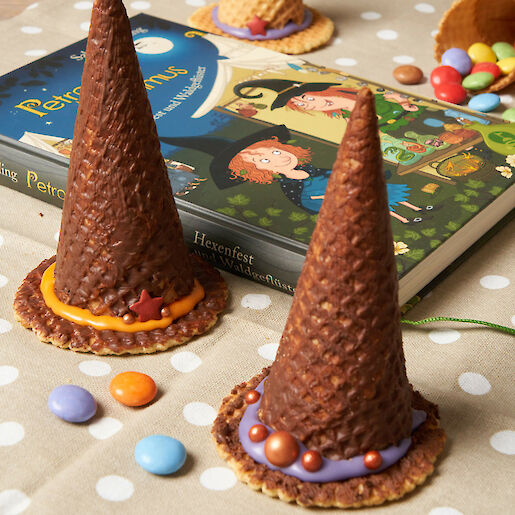 Zur Walpurgisnacht, zu Halloween, für eine rauschende Hexenparty oder falls Petronella mal zufällig auf eine Tasse Kakao vorbeikommt – bei uns bekommt jede kleine Hexe einen süßen Hexenhut zum Wegnaschen. Und für ganz besondere Hexen verstecken wir auch noch kleine Überraschungen im Inneren. Wie ihr euch auch ein paar essbare Hexenhüte macht, erfahrt ihr in unserem Tipp. Probiert es einfach aus.