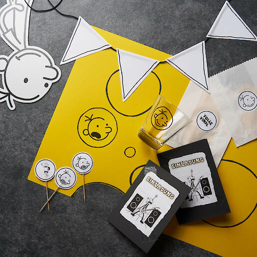 Ganz unter dem Motto "Bock auf Party!" haben wir natürlich einige kreative Ideen parat, um deine eigene Gregs Tagebuch-Party zu schmeißen! Von der Einladung über eine Wimpelkette bis hin zum Platzset ist alles dabei. Und das Beste: Du kannst die Deko für deine Party einfach selber basteln. Wie das klappt, verrät unsere Bastelanleitung. Also ran an Schere, Kleber und Papier und bastel dir dein eigenes Partyset für deine Greg-Party.