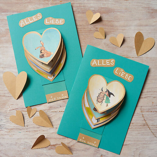 Was gibt es schöneres, als deinen Liebsten zum Valentinstag oder Muttertag eine selbstgebastelte Grußkarte zu schicken? Wir zeigen dir, wie du eine tolle Herzchen-Grußkarte mit Pop-Up-Mechanismus basteln kannst. Welche Bilder du in die 4 Herzen klebst, kannst natürlich du entscheiden. Wir haben uns – na klar – für ein paar unserer Buchhelden entschieden - natürlich kannst du aber auch Fotos hierfür benutzen, um die Karte noch persönlicher zu machen!