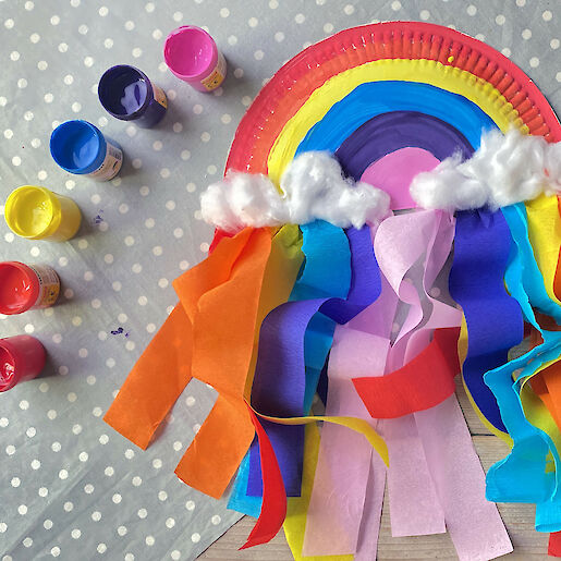 Wir basteln uns einen Regenbogen aus Papptellern, Farbe und Krepppapier für unser Zimmer. Ein wirklich farbenfroher Hingucker fürs Fenster, für die Tür oder auch einfach für die Wand.